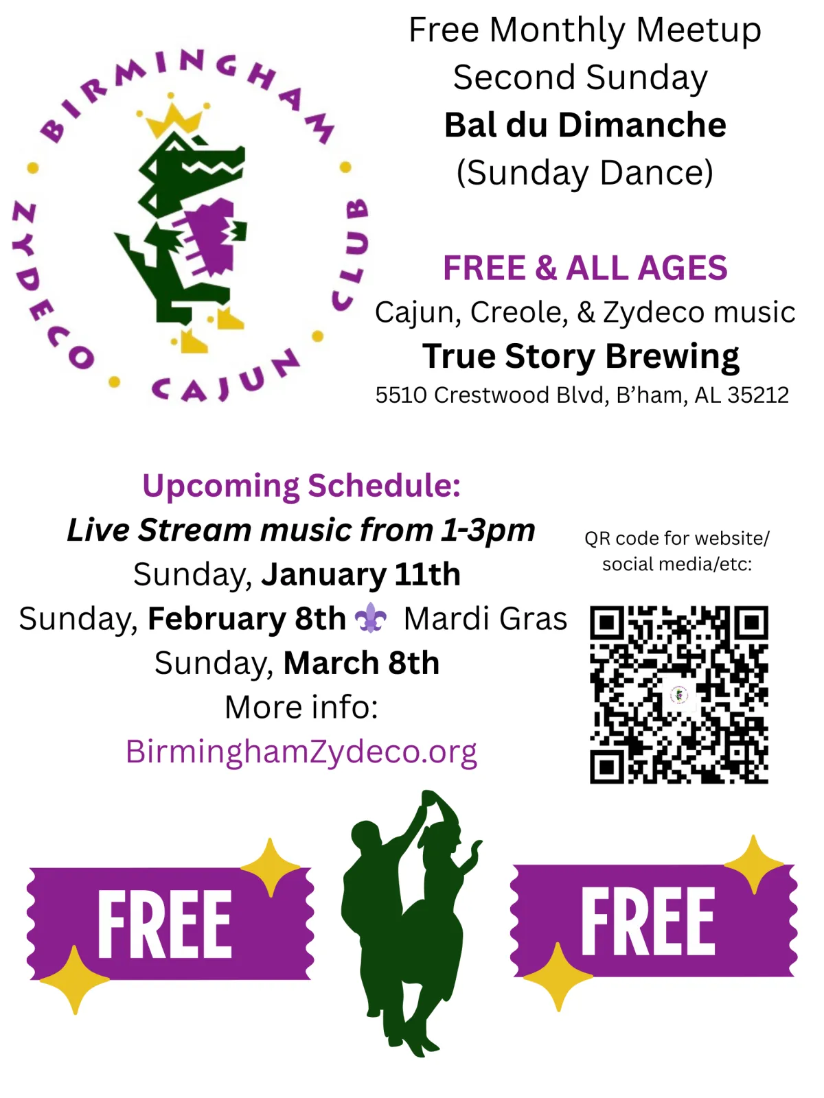 Description: Birmingham Zydeco Cajun Club ("BZCC") Members and Friends will meet in the side room of True Story Brewing (which has a sound system and room to dance) for Cajun/Creole/Zydeco music on the 4th Thursday of every month. Members of Birmingham’s Swamp Poppas band join when they are able. All musicians are welcome and encouraged to bring their instruments and join in a casual Jam. Dancers are encouraged to bring friends that dance. We will stream music before/after the Jam. True Story Brewing has a full bar, food and space to gather. Please join us!